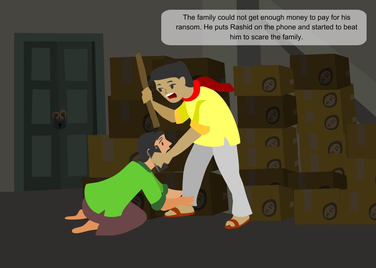 In the third book, a Rohingya man accepts an offer to work overseas and finds himself trapped in a shipping container in an unknown country. His family can hear his cries as his abductors brutally beat him, while demanding ransom money.