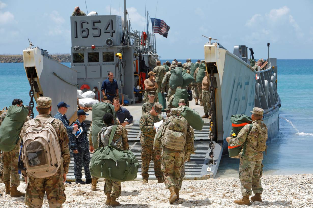 Soldiers from the 602nd Area Support Medical Company and other Army personnel board a Navy landing craft during their evacuation in advance of Hurricane Maria, in Charlotte Amalie, St. Thomas, U.S. Virgin Islands September 17, 2017. REUTERS/Jonathan Drake