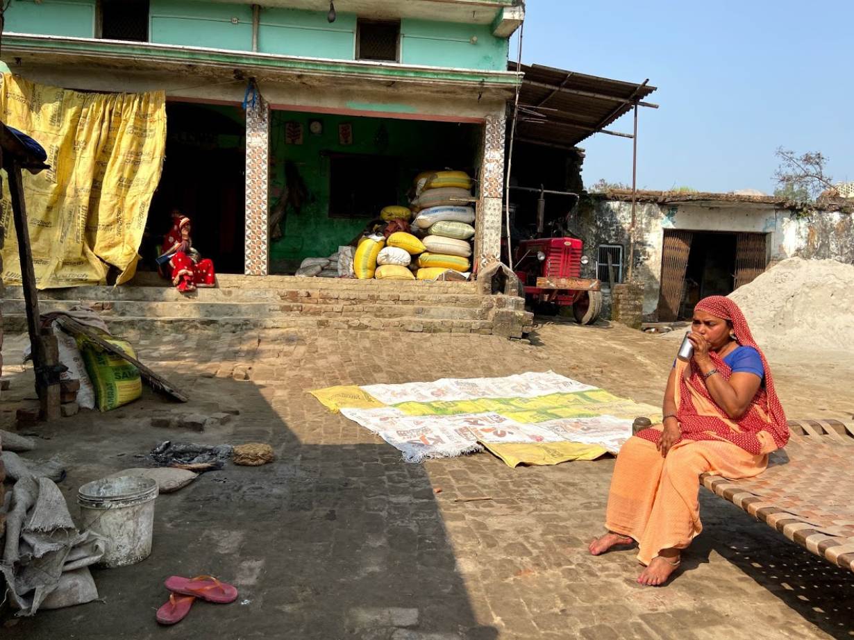 Farmer and trainer Meera Chaudhary has tea at her home in Janakpur village, India, on Feb 4, 2020. Thomson Reuters Foundation/Roli Srivastava