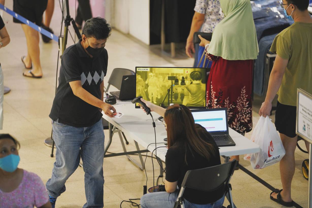 Shoppers at a thermal scanner at the entrance of a mall in Singapore. July 2, 2020. Thomson Reuters Foundation/Nicholas Yeo