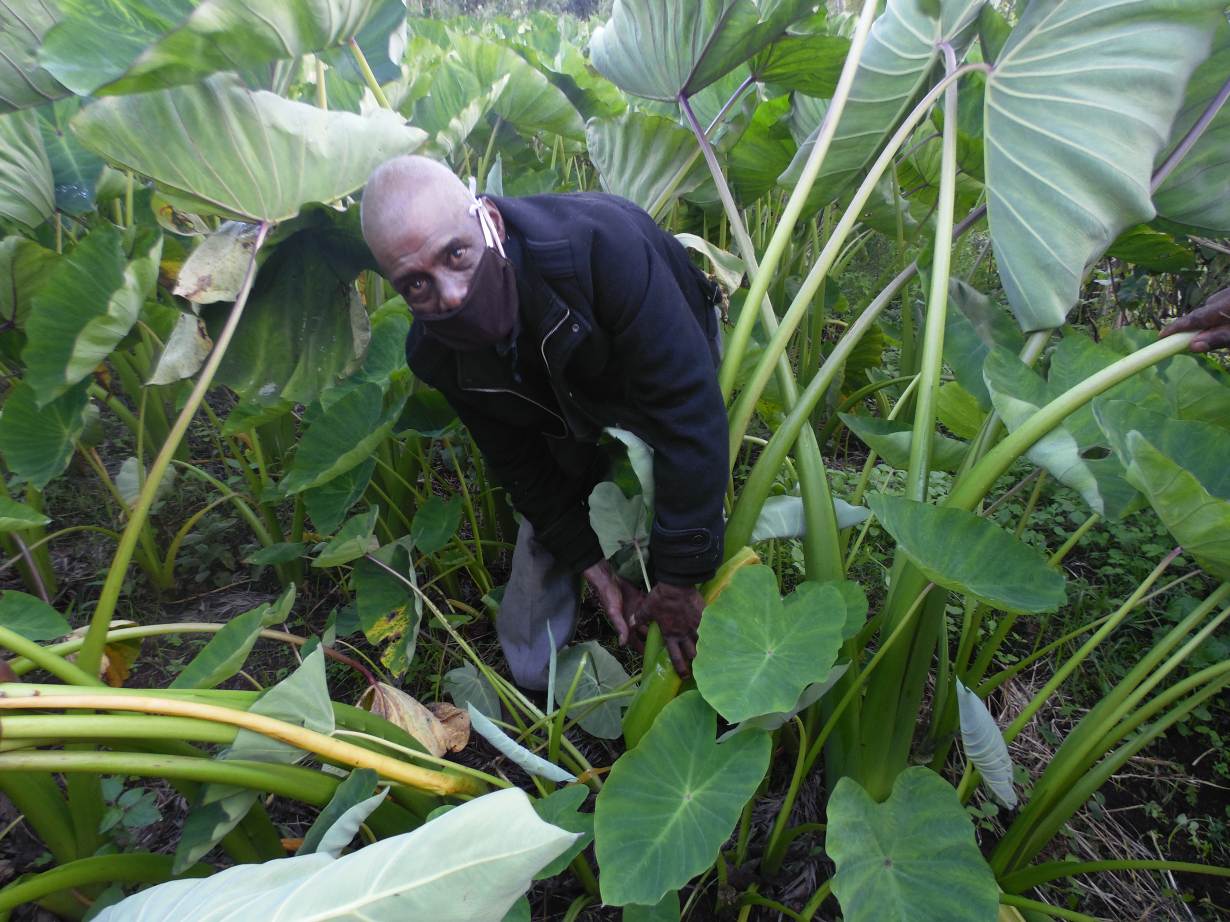 Joseph Kimathi working in an arrowroot field at his farm in the village of Katheri, Meru County, Kenya, April 25, 2020. Thomson Reuters Foundation/Caroline Wambui