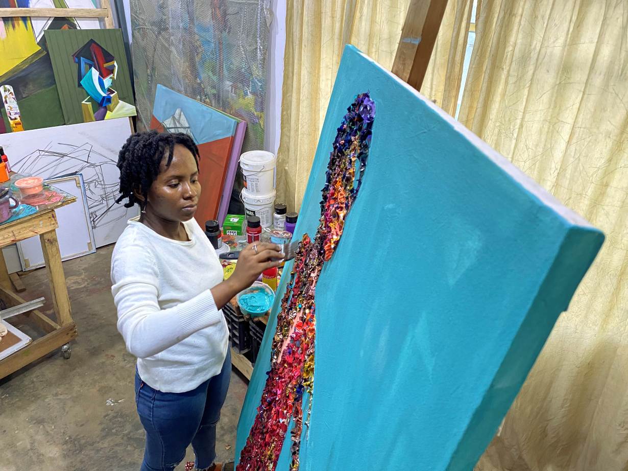 Akpojotor's work combines art and fashion on canvas, complimented with acrylic paint. A sketch of a woman's profile comes to life as she carefully adds tiny slivers of fabric to colour her skin, lips and clothing. Another canvas features a child playing, her form in bright swatches, casting a shadow.