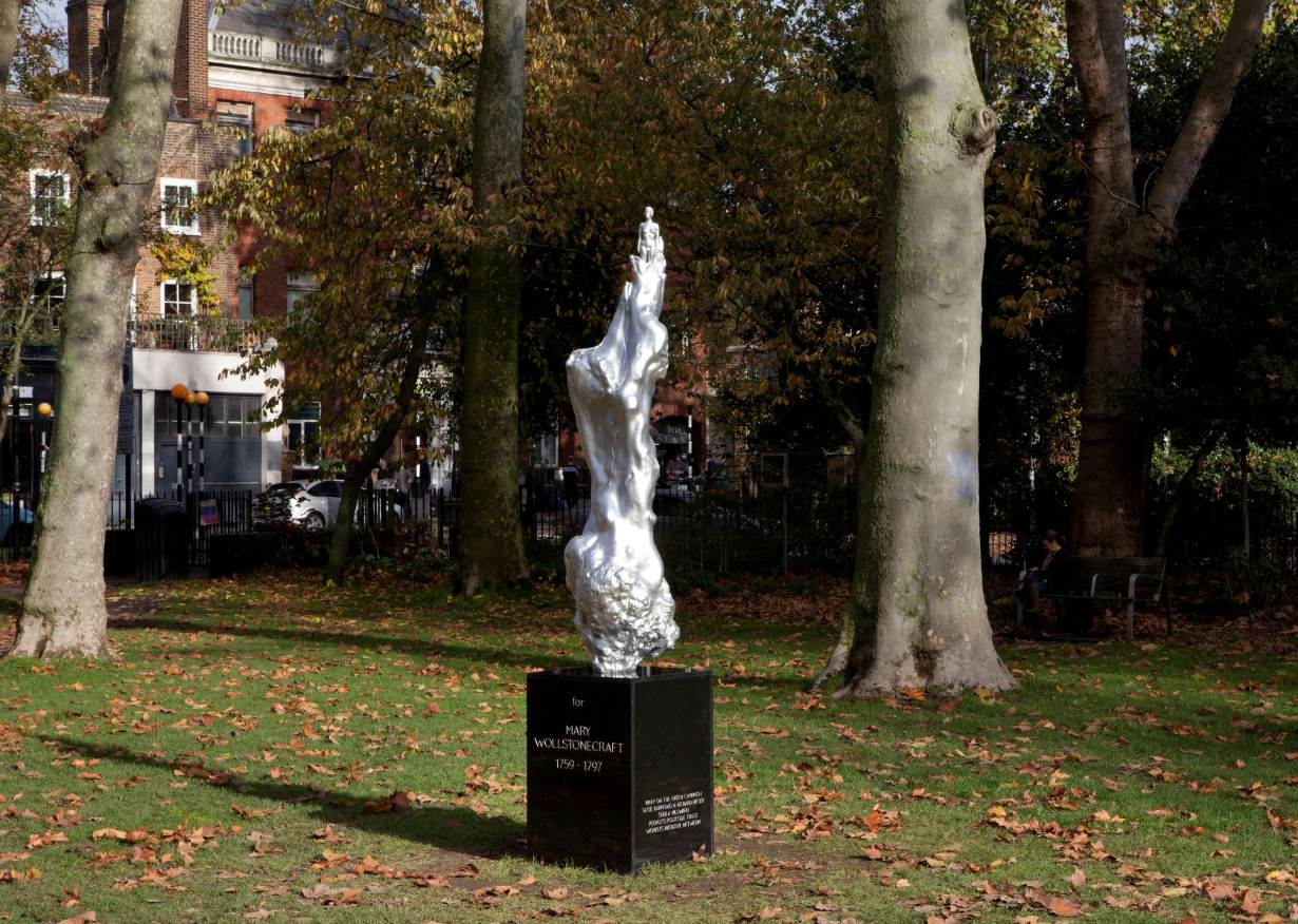 Cast in silvered bronze, "A Sculpture for Mary Wollstonecraft" sits on a plinth bearing Wollstonecraft's quote: "I do not wish women to have power over men, but over themselves".