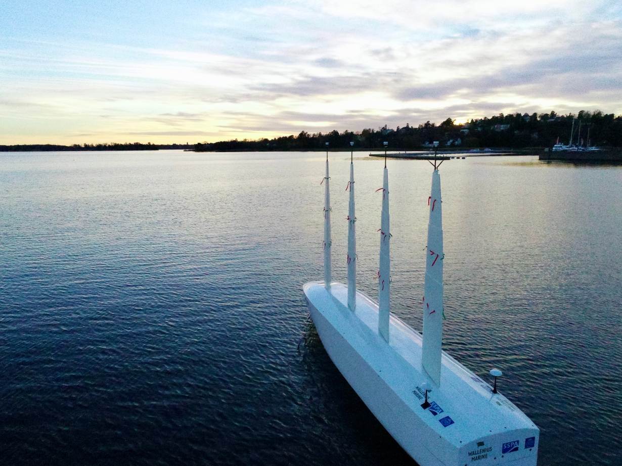 The sails, however, look little like traditional billowing fabric sails, instead more closely resembling aircraft wings rising vertically from the deck.