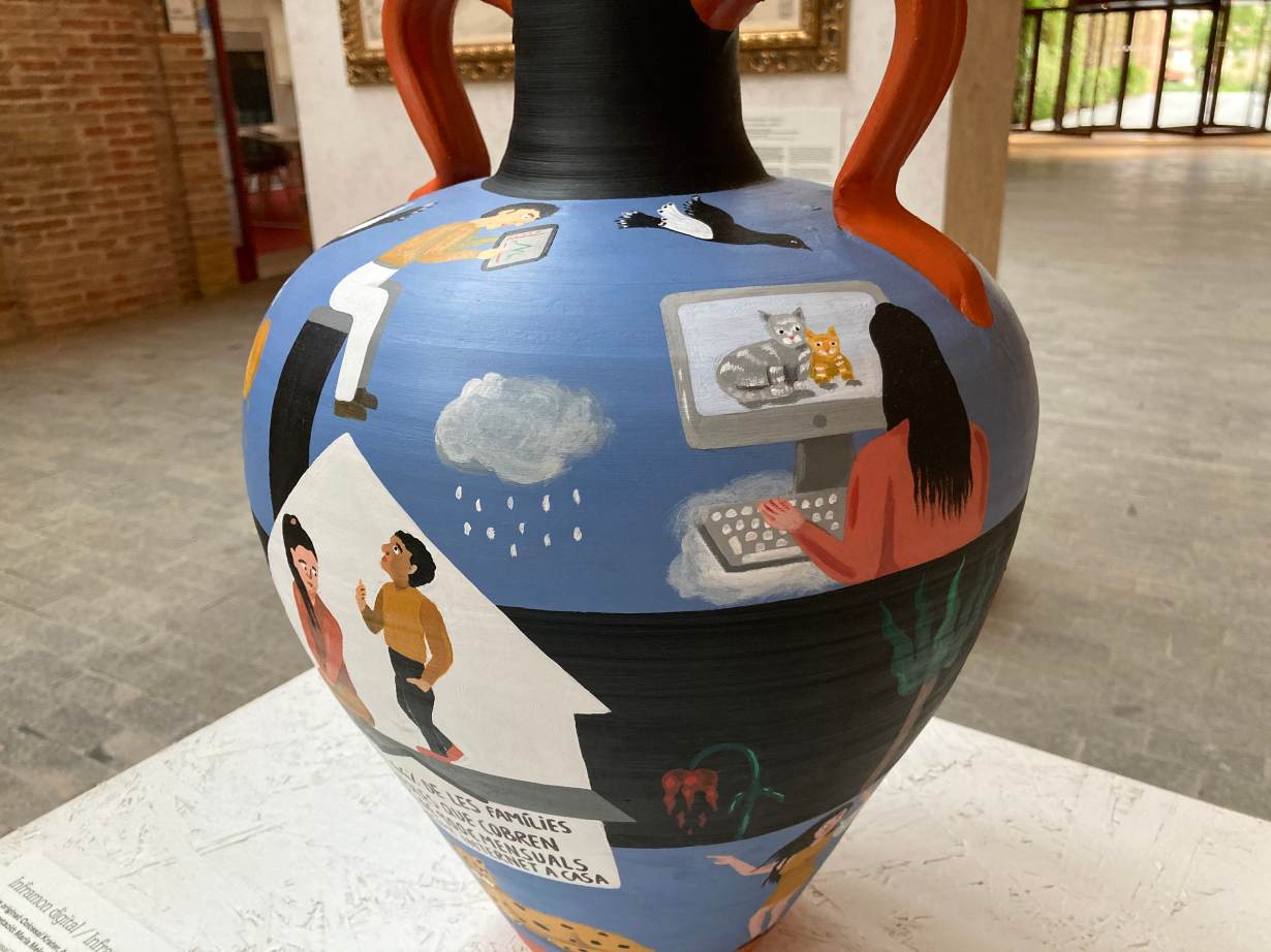 The scene decorates a ceramic pot by Spanish artist Maria Melero – her modern-day version of an ancient Greek pot – which is included in the exhibition to illustrate how the digital divide has impacted children.
