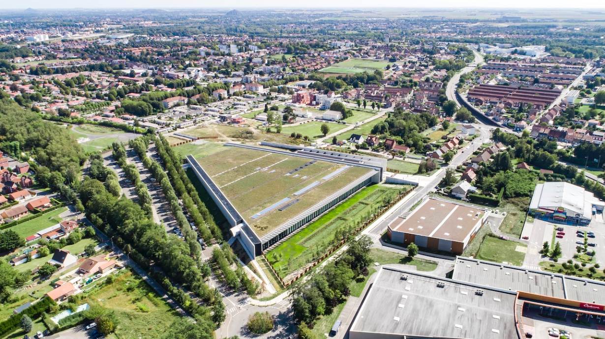 The 18,500 square metre glass and steel building was designed to blend into the local environment, with a grass covered roof where wildflowers grow in the spring, that helps with rainwater management to prevent flash flooding.