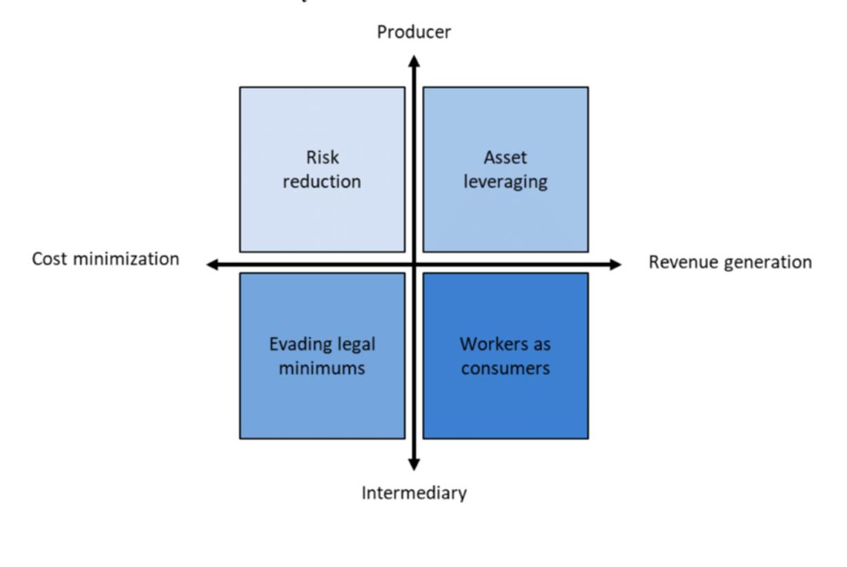 The manner in which we identify and analyse business use of modern slavery is by turning to four models: risk reduction, asset leveraging, evading legal minimums, and workers as consumers (see Figure 1). These models tend to materialize in low-waged work, often where workers confront precarious, short-term, and informal conditions.