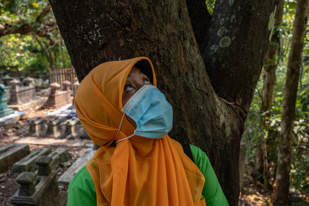 A short drive away, Ismokoweni, who leads 'Aisyiyah's local environmental chapter and goes by one name, picks her way past painted gravestones towards an area of damaged forest where the group has also planted seedlings.