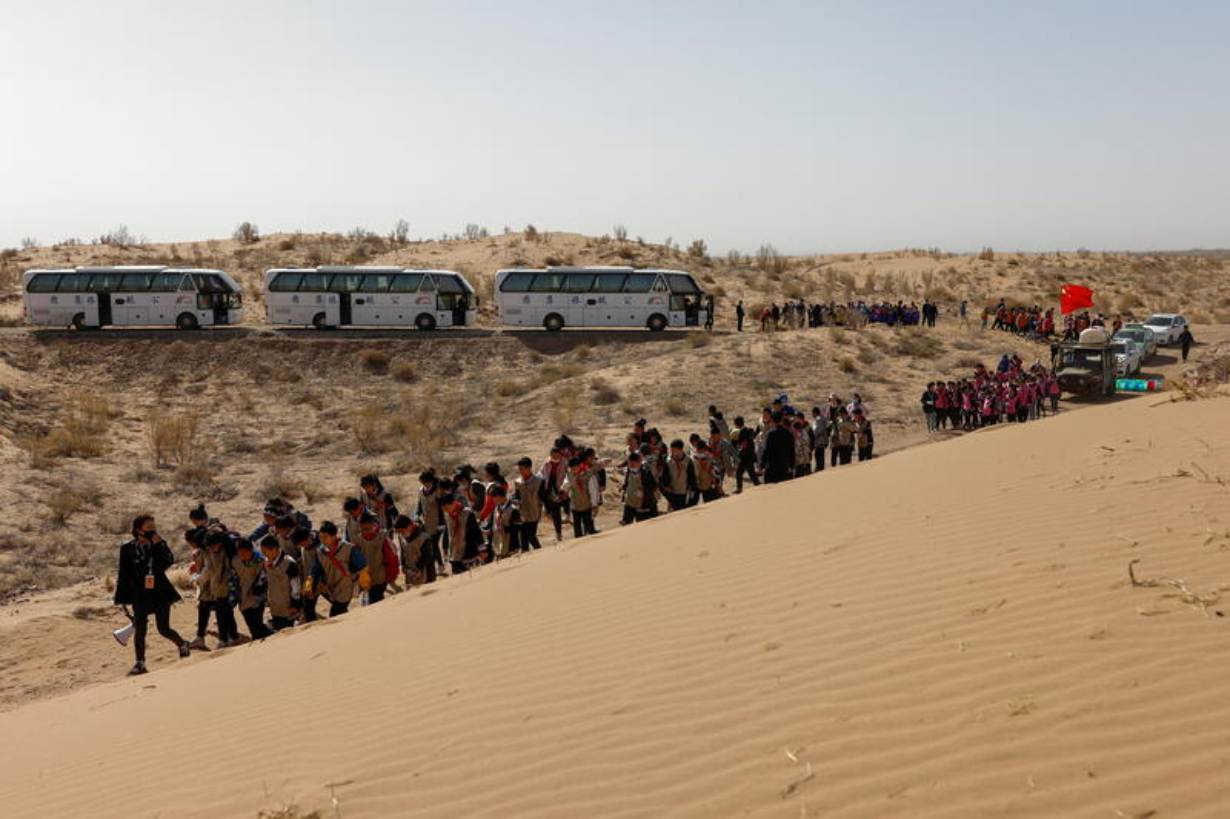 Now a local institution in northwest China's Gansu province, Wang and his family lead busloads of young volunteers from the provincial capital of Lanzhou into the desert each year to plant and irrigate new trees and bushes.