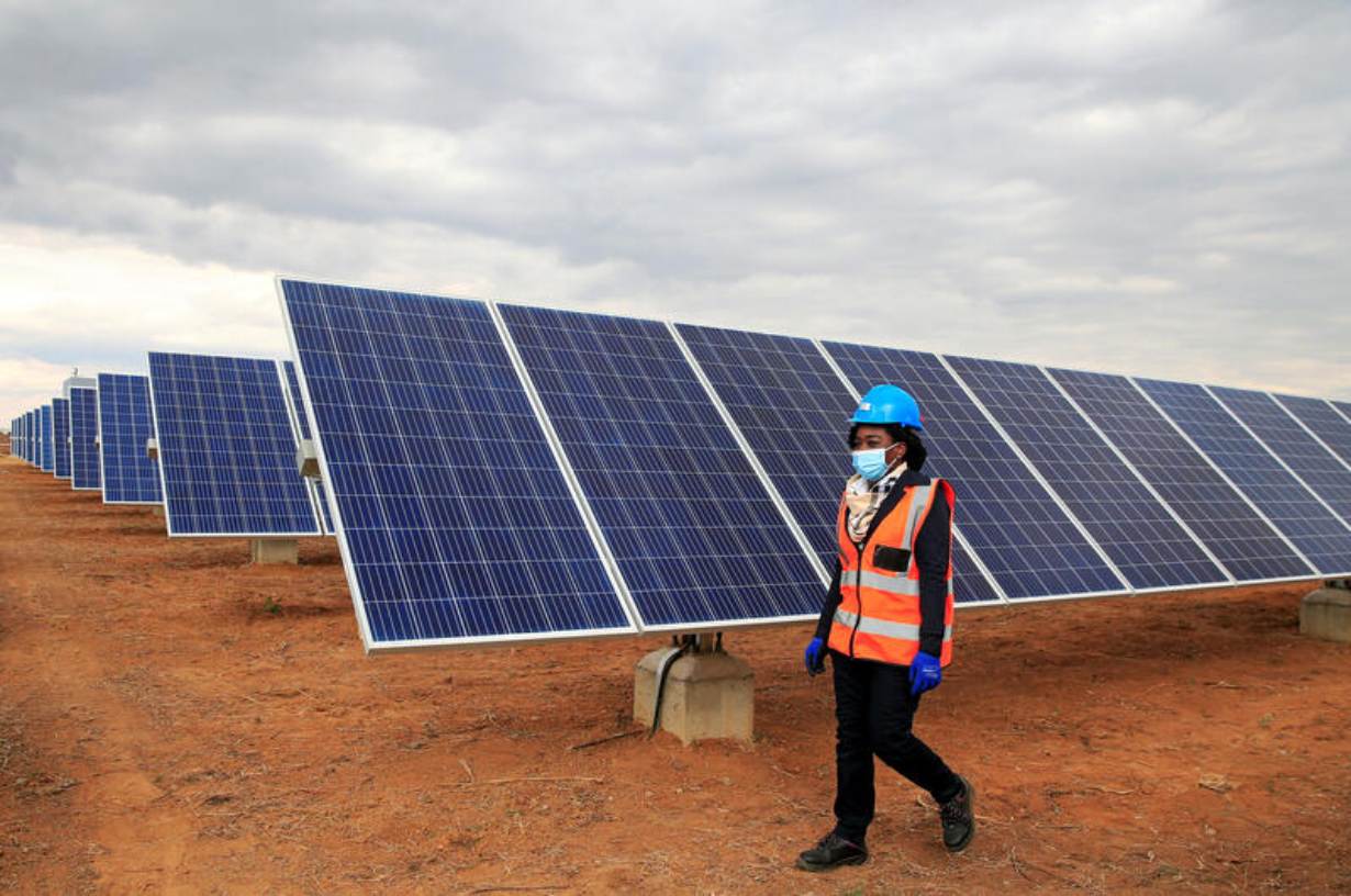 A worker walks past solar panels at Centragrid power plant in Nyabira, Zimbabwe, June 22, 2020. REUTERS/Philimon Bulawayo