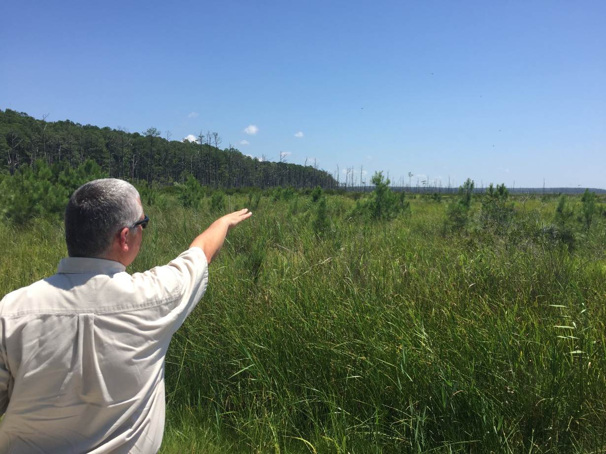 Sea level rise, happening particularly fast on the state's Eastern Shore, is pushing the saltwater marsh up into the hills, killing surrounding forests and opening the way for invasive species to gain a foothold and upset the balance that allows this ecosystem to flourish.