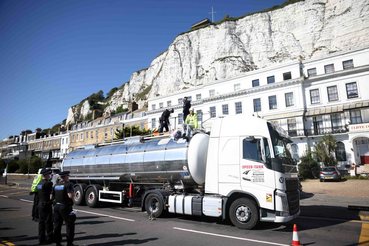 About 40 activists from the environmental group Insulate Britain briefly brought to a standstill all traffic to and from the Port of Dover, which handles about 6,000 trucks a day as the main artery for trade over the English Channel.