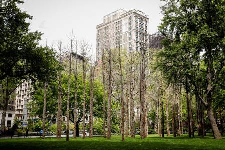 The grove of 49 dead Atlantic Cedars, installed in a Manhattan park, are victims of saltwater inundation from rising seas due to climate change, says its creator