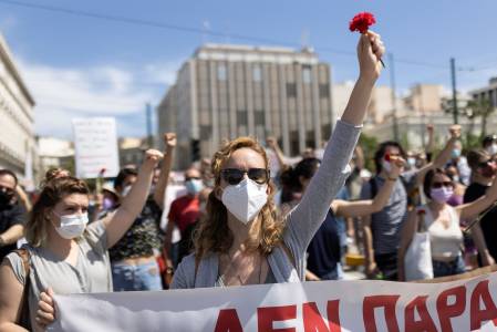 Police estimated about 6,500 striking workers gathered outside parliament, many waving red flags and banners reading 'we won't become slaves of the 21st century'