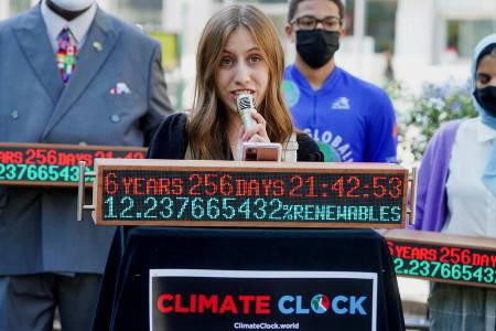 The clock in New York's Union Square now also shows the amount of the world's energy supplied from renewable sources, currently at 12% and slowly rising
