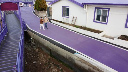 Residents of the 'Purple Islands', have painted their houses, roads and bridges, and planted purple flowers to transform their town into a tourist attraction