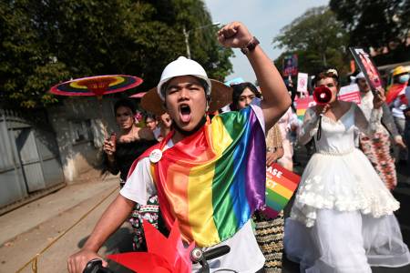 In Myanmar, LGBT+ people join anti-coup protests with rainbow flags