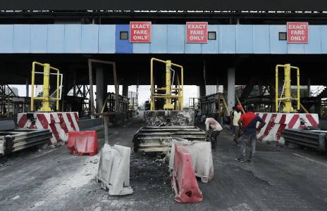 Burned-out buildings and armed gangs in Lagos despite president's plea